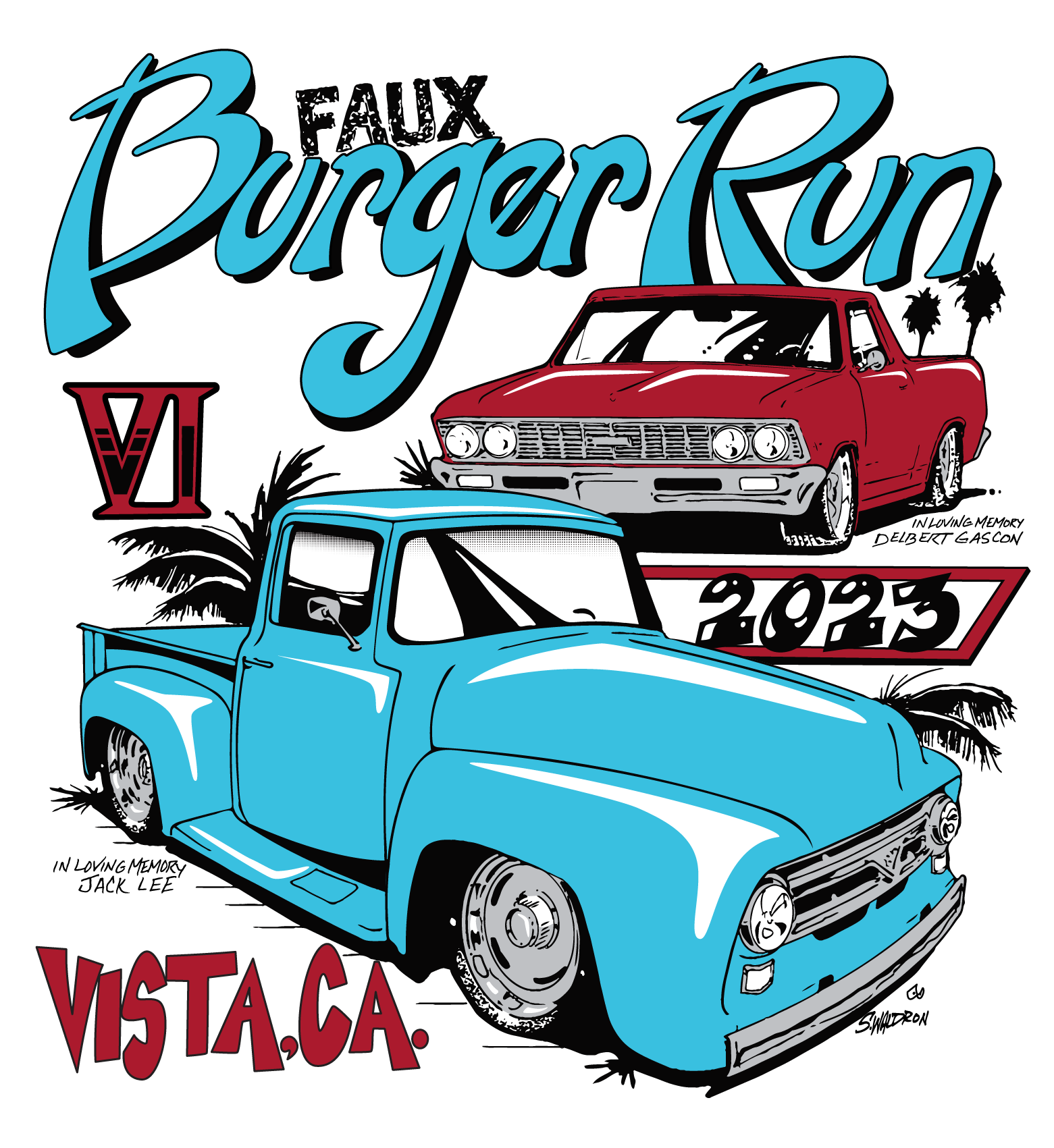 Vectorization art typically starts with a base. For the Burger Run design, the image to the left was the original scanned artwork. Some jobs such as the Burger Run have specific designs that need to be followed with small details that can be decided upon by the vectorizer. Color themes similar to previous years were chosen for the vehicles, along with some choice highlights/shadows to create a better sense of depth on the flat colors.
